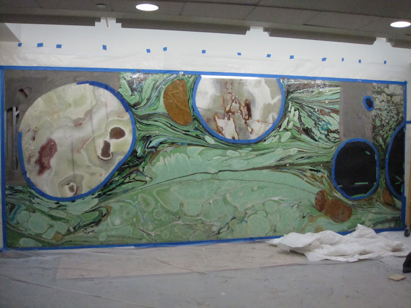 This is the pattern Mike has to cut out for the marble insert. We calculated the placement based on the original pattern and by holding up the mosaic to make sure it was exact
